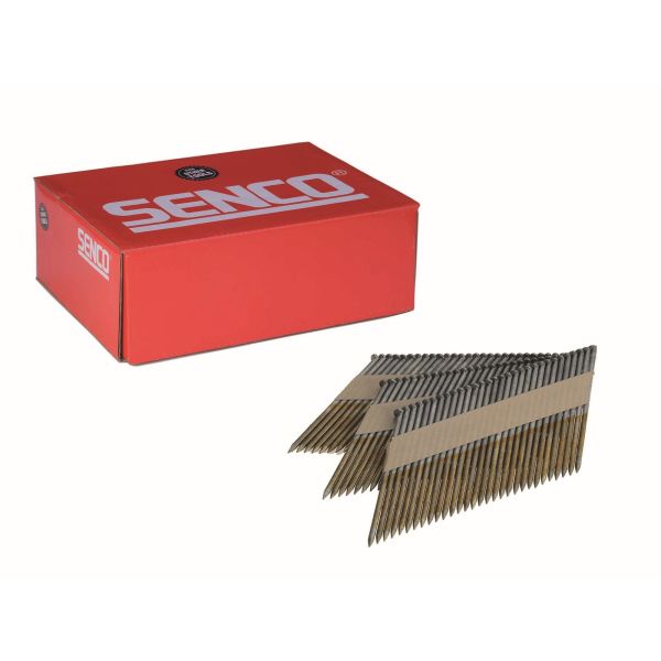 Anvendelse: Til sømning, tagspær, paneler, paller osv. Andet: Båndet stangsøm, 34° hældning. Tæt/papirstribet. D-formet overskrift. Neglen er belagt med Sencote, et typegodkendt klæbemiddel: nr. 3276/92. Neglen fås med en diamantspids eller den mejselskårne spids, der tillader sømning uden revner. Kort stang - 30 søm / stang. Velegnet til Senco værktøjer Frame Pro 601, GT90CH, FP 701XP, MAX SN890CH2.