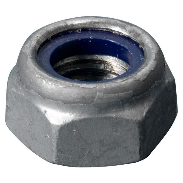 M-gevind. Hex-låsemøtrik med nylonring I henhold til DIN 985. Stål klasse 8.0 varmgalvaniseret.