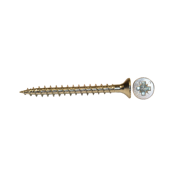 Træskrue med sænkehoved og pozidriv tværpæle.