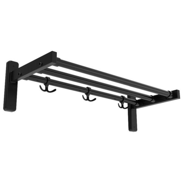 Beslag i stålprofil, pulverlakeret i sort. Hylder i sorte plastbelagte rør.