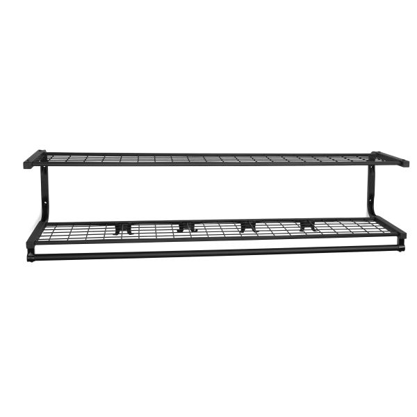Hatreol af stål (hatstativ af stål). Hyldepladen er hvidlakeret eller sort med konsoller og galgestang i forkromet, sort eller hvid udførelse.