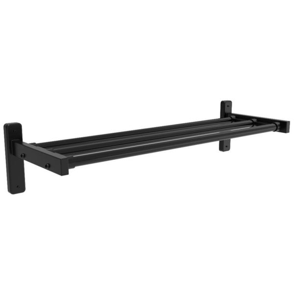Beslag i stålprofil, pulverlakeret i sort. Hylder i sorte plastbelagte rør.