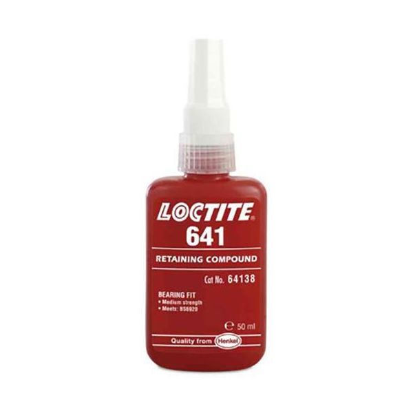 Loctite 641 er en lejemontering udformet til limning af cylindriske monteringsdetaljer, især ved behov for demontering ved vedligeholdelsesarbejde. Produktet hærder uden kontakt med luft mellem tætsluttende metaloverflader, og det forhindrer slør og lækage på grund af stød og vibrationer. Ideel til dele, der kræver efterfølgende demontering, f.eks. montering af lejer på aksler og i lejehuse.