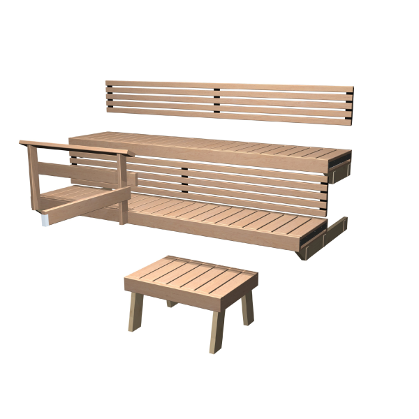 Harvia Formula, Finlands mest populære model af saunabænke, fås som færdige alt-i-en-pakker. Bænkene er robuste og nemme at installere.