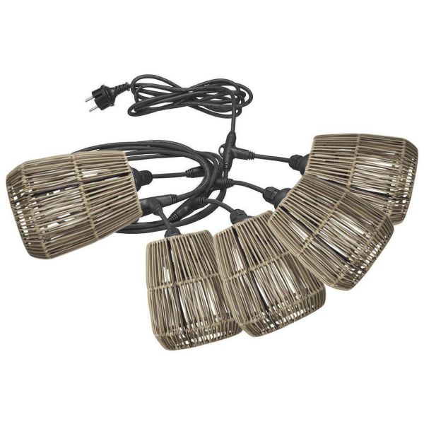 Flex Out lysslynge til udendørs brug (IP44) med 5 lampeholdere. Totallængde 6,5 m, 2,5 m til første lampeholder, derefter 80 cm mellem hver lampeholder. 15 cm fra T-samling ned til skærmringen. Lyskæden leveres med 5 stk. Saigon lampeskærme i konstrotting. Skærmen er 18 cm bred og 20 cm høj.