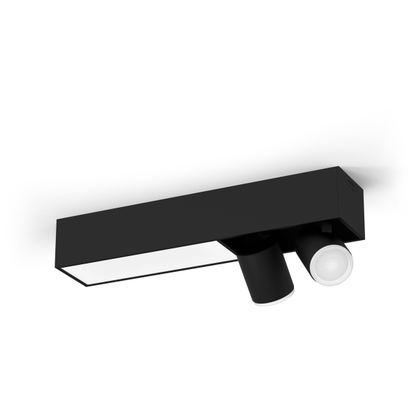 Philips Hue Centris 929003808401 Spotlight. Philips Hue Centris er en moderne og stilfuld smart lampe med et unikt design, der kombinerer stemningsbelysning med højfunktionelt lys. Den er ideel til større rum, der kombinerer forskellige funktioner, såsom et kombineret køkken og stue, og til områder som en entre, hvor spotlamper kan bruges til at give lys til opbevaring, hylder og dekorationer. Denne lampe i sort har en central lyspanel og to justerbare spotlamper. Hver af de tre lyskilder er White and color ambiance, hvilket betyder, at de kan justeres til valgfri farve eller nuance af varmt til køligt hvidt lys. De kan styres individuelt eller samtidig. Det er nemt at justere og tilpasse din belysning i Hue-appen, som også indeholder et omfattende scenegalleri, dynamiske effekter, smarte automatiseringer og meget mere.
