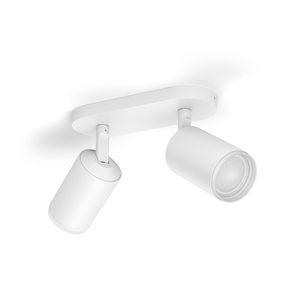 Philips Hue Fugato 929003810301 spotlys. Med Philips Hue Fugato-spotsserien kan du få farverig smart belysning i dit hjem på en elegant og moderne måde. De leveres med GU10-pærer med White and Color Ambiance, som tilbyder belysning i alle farver eller nuancer af hvidt lys samt øjeblikkelig trådløs dæmpning. Din belysning styres hurtigt og nemt med Hue-appen, smarte tilbehør eller endda stemmekommandoer via den hjemmeassistent, du foretrækker. Dette spotlys i hvid har to justerbare hoveder, som kan rettes i den ønskede vinkel.