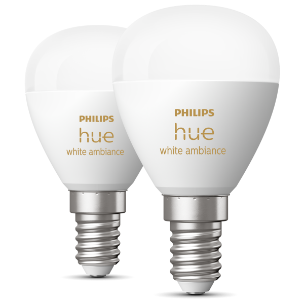 Dette 2-pak med to Philips Hue White ambiance Luster-lamper med E14-fatning gør det muligt at tilføje en valgfri nyanse af hvidt lys til dine mindre armaturer på få sekunder. Du kan justere mellem tusindvis af nuancer af varmt til koldt hvidt lys samt dæmpe belysningen uden yderligere installationer. Med Philips Hue-systemet for smart belysning kan du styre, justere og konfigurere belysningen efter dine ønsker og tilpasse stemningen i hjemmet til alle aktiviteter og anledninger. Opret personligt tilpassede indstillinger og automatiseringer i Hue-appen, og nyd nem kontrol via appen, smarte tilbehør og stemmestyring. Tilføj en Hue Bridge for at udnytte alle funktioner i Hue-systemet.