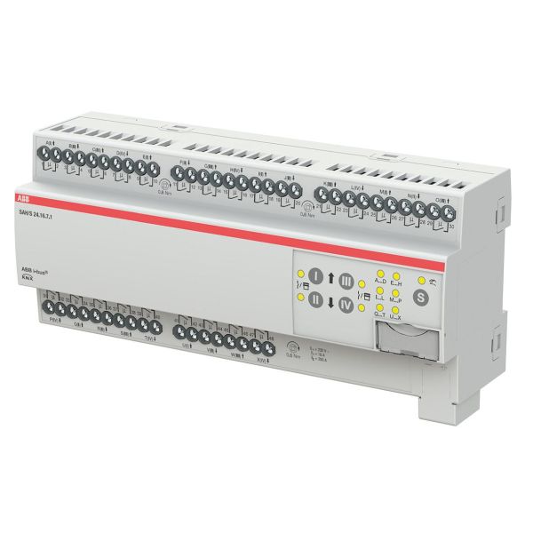 Den kompakte kombikører har 8, 16 eller 24 uafhængige udgange (ikke elektromekanisk sammenkoblet). Udgangene kan bruges individuelt via ABB i-bus KNX til at skifte elektriske belastninger eller parvis til styring af 230 V AC-skodder eller markiser. Enheden har en manuel kontrol, som også kan deaktiveres. Via manuel betjening kan udgangene betjenes manuelt, og gearskifte eller drevstatus vises. Enheden drives af busspænding og kræver ikke en ekstra strømforsyning.