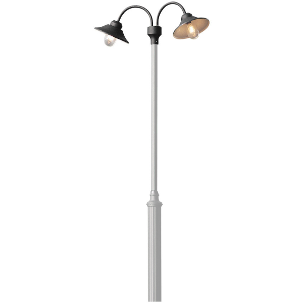 Konstsmide Vega er en stanglampe med dobbelte armaturer, til belysning af f.eks. have og gangbroer. Lanternen er lavet af sort aluminium og i armatuern kan der installeres to pærer med maksimalt 60 W effekt hver. Modellen har E-27 fatning og energiklasse A++-E.