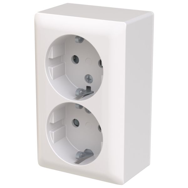 Dobbelt stikkontakt SAGA med terminaler til hver kontakt på stikkontakten for maksimalt fire faste ledninger. Safety+ findes i indsatsen. Biocirkulær plast anvendes i bundpladen og centerpladen. Saga 2-vejs vægstikkontakt til overflademontage.