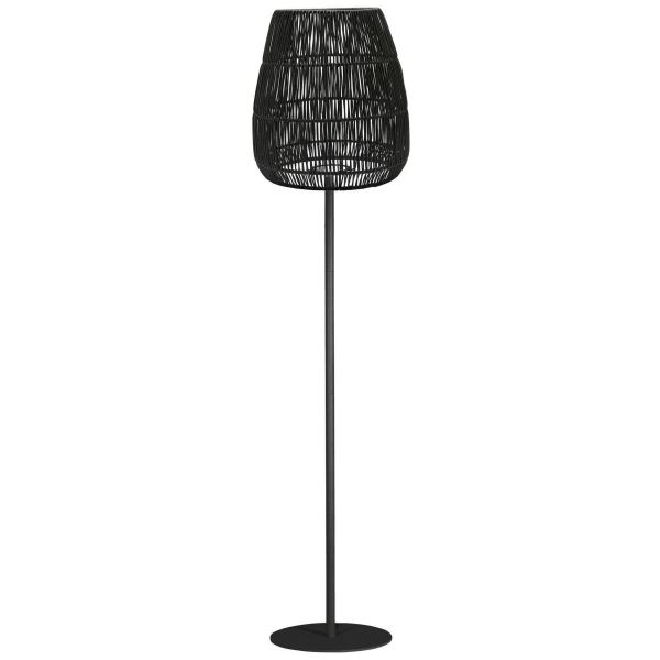 Gulvlampe Agnar inkl. skærm Saigon i sort, som begge dele er velegnede til udendørs brug. Lampens fod har en E27 lampefatning til en lyskilde med maks. 40 W; vi anbefaler lyskilden 1806404 Elect Led Filament Edison Clear 64mm. Over lyskilden og lampens fod sidder et hvidt plastlåg samt en pakning, der beskytter mod fugt. Lampeskærmen har et flettet mønster, der giver et flot lysmønster, og er lavet af konstrotting, som er et vejrbestandigt materiale. Lampeskærmen fastgøres i lampefoden ved hjælp af et særligt beslag. Ledningslængde 200 cm.