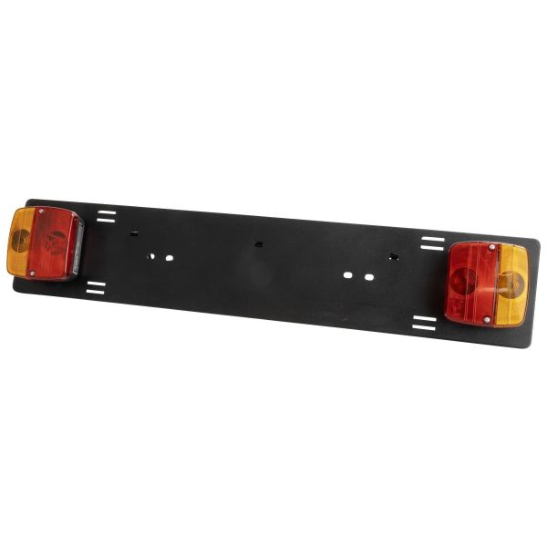CJ 547184 Baglygtesæt. Lysrampe og baglygter til slæbevogne og traktortrailere. Med multifunktionslamper til bremselys, blinklys og nummerpladelys monteret på et plastskilt med huller til nummerpladen og montering på anhænger.