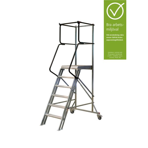 Trappen har gelændere, så du trygt kan klatre op og ned, og platformen har faldsikring på alle fire sider. Trappen har 110 mm dybe trin. Arbejdsplatformen er let at manøvrere også i mindre rum, hvilket gør den perfekt til brug i lagerlokaler for nem adgang og bedre rækkevidde ved pallereoler m.m. Den er også velegnet til værkstedsmiljø og industri takket være sin robuste konstruktion.
