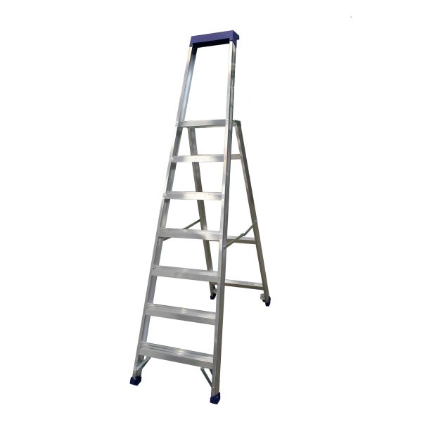 En sikker og robust trappestige med hydraulisk nittede trin, stabil platform og praktisk værktøjshylde. Trindybden er 81 mm, og buen er 600 mm høj. Hjul er monteret på det bageste par ben for nem bevægelse.