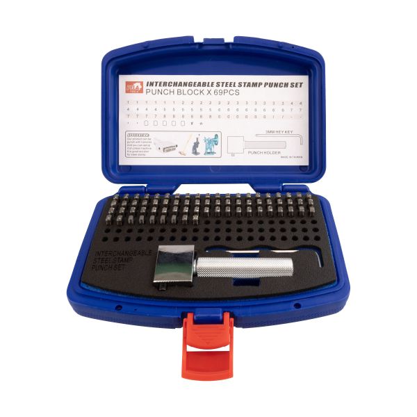 Sættet leveres i en robust, slagfast blå opbevaringskasse med rødt spænde, hvor alle stempler og værktøjer ligger sikkert organiseret i skumindlæg for at forhindre skader. Med din 1451-skrifttype får mærkningen et professionelt og letlæseligt udtryk.