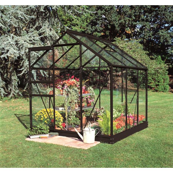 Varenr.: 4075554Pakkeløsning fra Halls med drivhuset Popular 66 (F09940) på 3,8 m² samt en sort sokkel/fundament, der passer til drivhus Popular 66 fra Halls med et areal på 3,8 m².