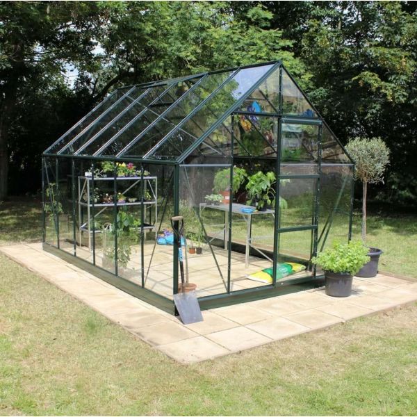 Pakken fra Halls indeholder drivhuset Universal 70882 på 9,9 m² samt et sort, passende fundament.