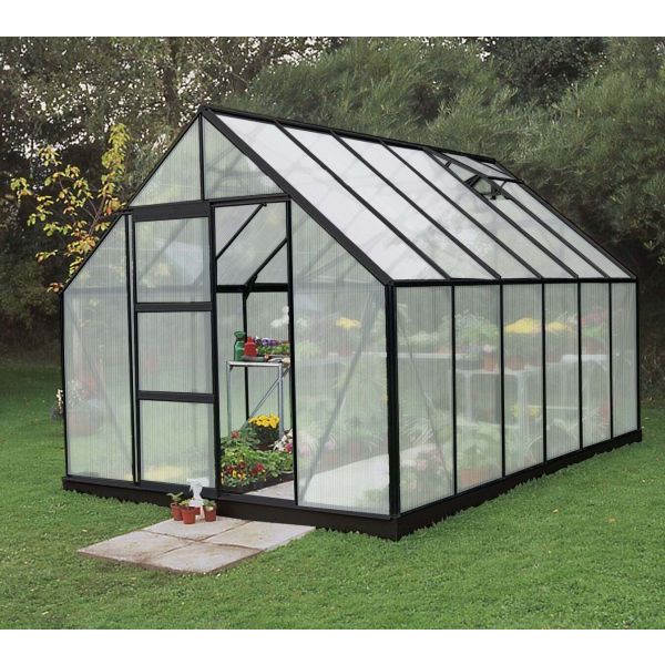 Pakkeløsning fra Halls med drivhuset Universal 128 (F09712) på 9,9 m² samt en sort, tilpasset sokkel/fundament.