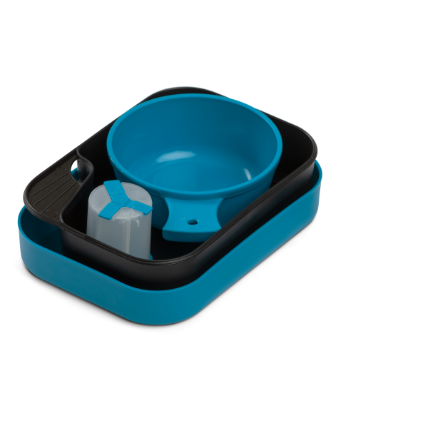 Tallerkenæske bestående af 2 dybe tallerkener, kombinationsbestik, krus og krydderkrukke. Velegnet til camping, udflugter og vandreture. BPA-fri.