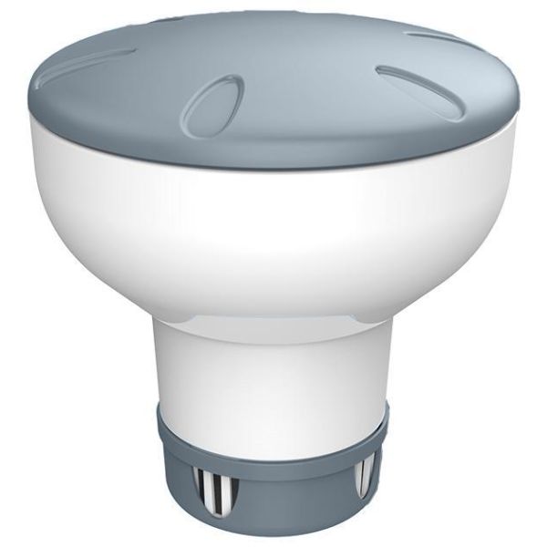Den fleksible klordispenser er perfekt til brug sammen med små 20 g klortabletter. Ved at bruge dispenseren undgår du at lægge tabletterne direkte i poolskimmeren. Dispenseren flyder i poolen og doserer klor langsomt til vandet. Den kan fyldes med den mængde langsomt opløselige klortabletter, du ønsker, og justeres til det rette klorniveau ved at dreje doseringsdelen nederst på dispenseren. Til ekstra sikkerhed er dispenseren udstyret med et børnesikret låg. Tabletterne medfølger ikke.