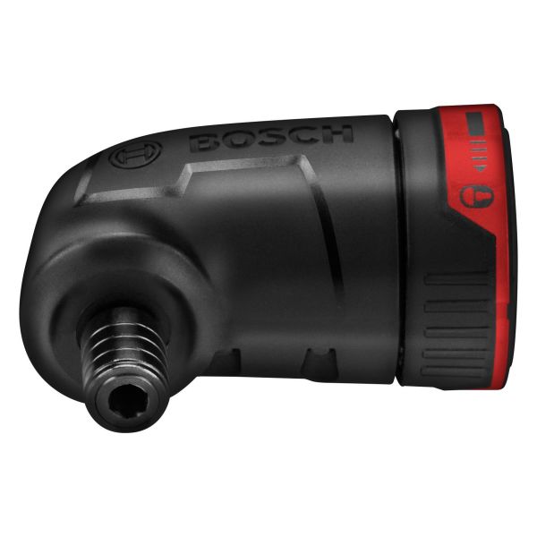 Retvinklet adapter med bitholder til applikationer med begrænset plads til Bosch GSR 18V-60 FC og GSR 18 V-EC FC2 med FlexiClick-system. Bosch FlexiClick additiver kan låses i 16 forskellige positioner (360°) uden at fjerne dem fra batteriskruetrækkeren.