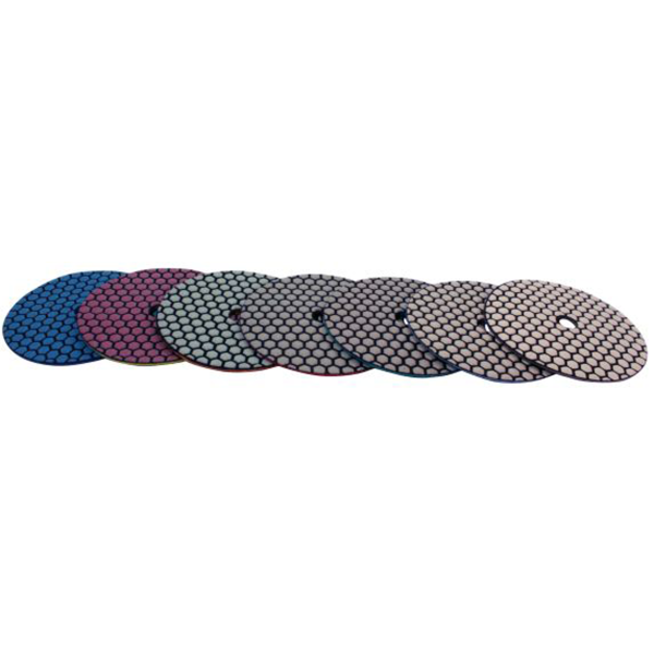 Sæt diamantslibeskiver, der indeholder grus; K50, K100, K200, K400, K800, K1500 og K3000. Højtydende diamantpoleringssystem til tørslibning af beton, bygningselementer, natursten. Den specielle segmentspecifikation giver en meget effektiv slibning/polering med meget højglanstal ved fuld poleringscyklus (K50-K3000).