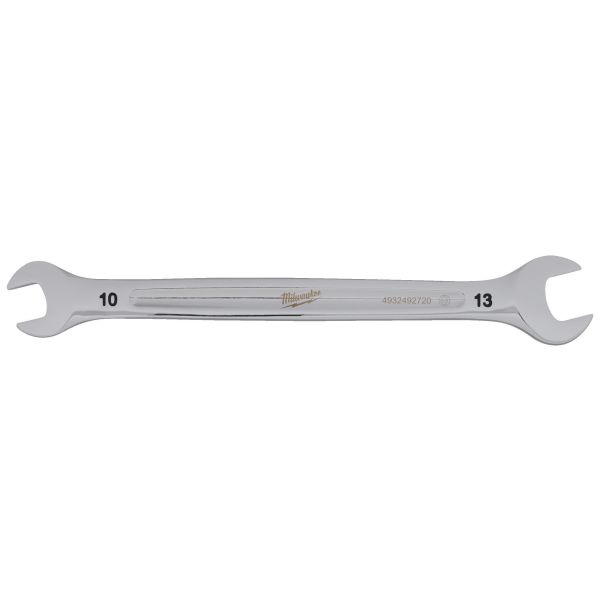 Milwaukee dobbelt ringnøgle med rundt L-profilhåndtag og smalt hoved for bedre adgang. Blækstemplede størrelser og kromfinish til rustbeskyttelse.