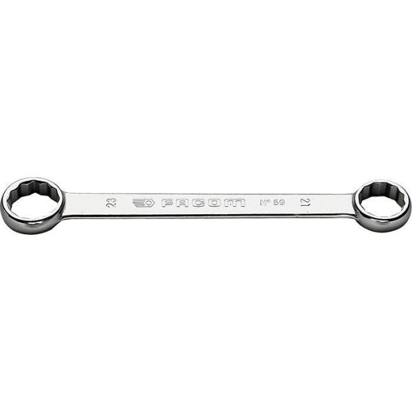 Facom 59.18X19 er en kort ringnøgle med slankt hoved, der har en grebbredde på 18 x 19 mm. Tolvkantsringe med OGV-profil for kraftig tilspænding.