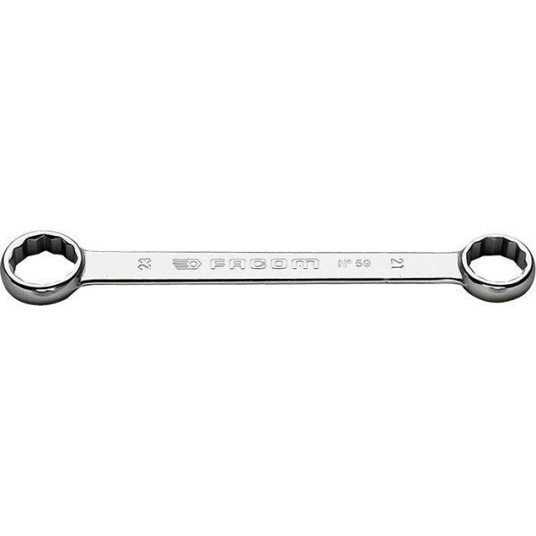 Facom 59.26X28 er en kort ringnøgle med slankt hoved, der har en grebbredde på 26 x 28 mm. Tolvkantsringe med OGV-profil for kraftig tilspænding.