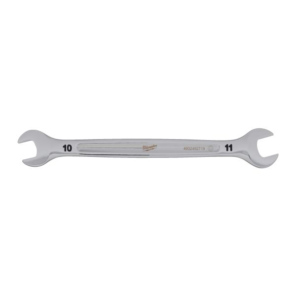Milwaukee dobbelt ringnøgle med rundt L-profilhåndtag og smalt hoved for bedre adgang. Blækstemplede størrelser og kromfinish til rustbeskyttelse.