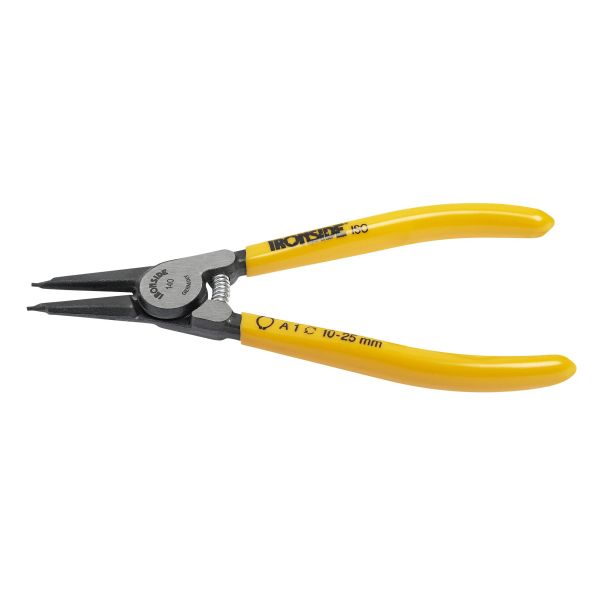 En lige rilleringstang med en længde på 180 mm, som har et poleret beskyttende lakeret hoved og plastdyppede grebærmer. Velegnet til udvendige sporringe og har en diameter på 19-60 mm.