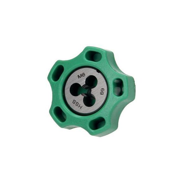 Gevindrensningsværktøj i form af en plastmaskineknap med gennemgående huller og monteret gevindsektion.