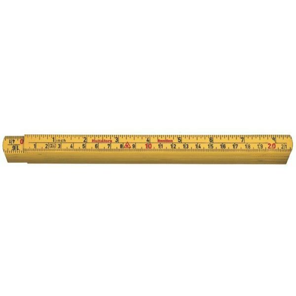 Gul 2 meter log lavet af glasfiberforstærket polyamid, hvilket giver øget modstandsdygtighed over for fugt. Gradation med sorte tal på begge sider, metrisk i bunden og engelsk tomme øverst.