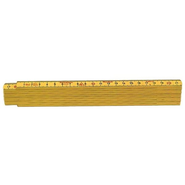 Meter log lavet af glasfiberforstærket polyamid, som giver øget modstand mod fugt. Metrisk graduering i sort på begge sider og røde decimetercifre.
