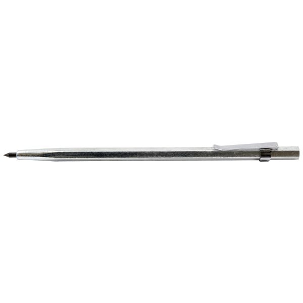 Varenr.: 3041997Forkromet tegnepind med sekskantet glat skaft, udstyret med clips og 5 mm hårdmetalspids.