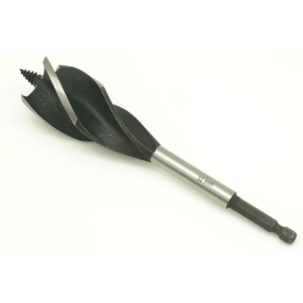 Centerbor med 4 skær, 1/4" sekskantskaft og trippelspiral til hurtig fjernelse af spåner. Helgevindet borrspids gør borret meget aggressivt. Op til seks gange hurtigere end traditionelle centerborer.