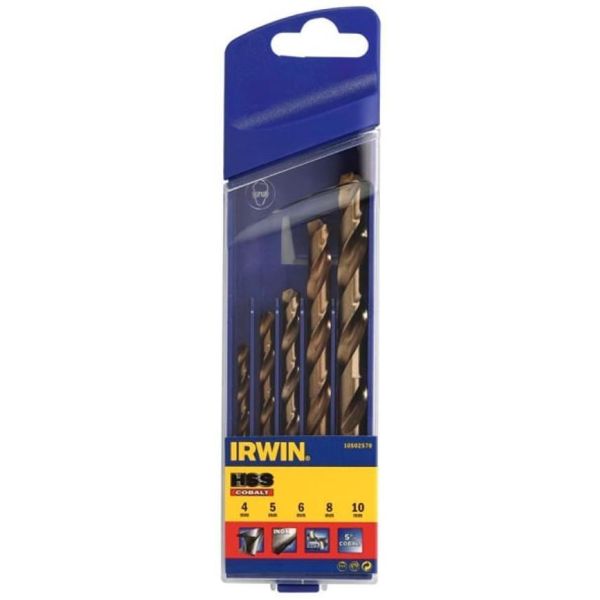 Irwin 10502570 er et borsæt i fem dele. Borsættet har borekrop i koboltlegering fremstillet af høj kvalitet HSS-stål. Indeholder 5 % kobolt (Co) – tilsat 5 % kobolt forbedrer borrens røde hårdhed (varmebestandighed) og slidstyrke og giver markant længere levetid.
