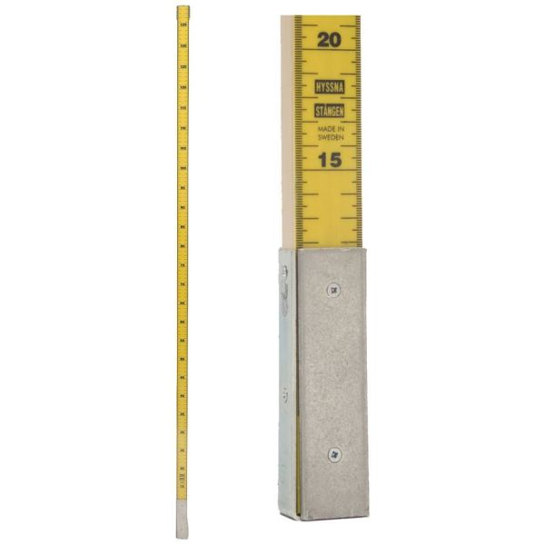 Målestok med trækkerne, overtrukket med krympeplast for bedre modstandsdygtighed mod vejr og snavs. Sort påtryk med graduering mod gul skala for høj læsbarhed. Forstærket metalfod til montering i grusring eller støbeplade.