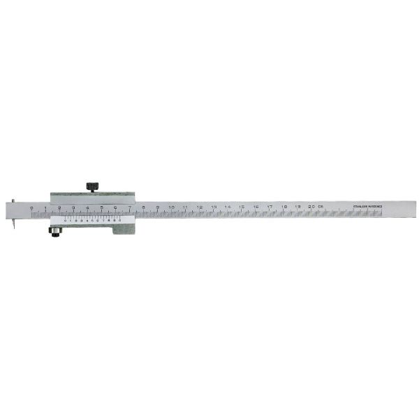Lavet af rustfrit stål. Målestang og glide som kalibre. Kuglelejerulle som en meddelelse, når du trækker mod kanten af emnet. Gradueret i millimeter med nonie skala 1/10 mm af 39 mm længde. Udskiftelig hærdet tegnespids. Leveres i plastikhus.
