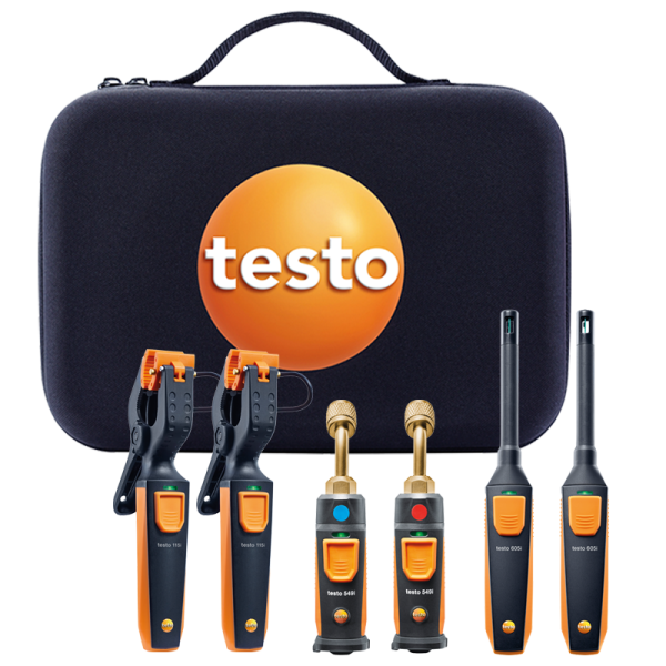 Testo SmartProbe Set BT+ er et komplet, trådløst målesæt til køle- og varmepumpeteknikere. Sættet indeholder to højtryksfølere (testo 549i), to fugt- og temperaturfølere (testo 605i) samt to rørtemperaturfølere (testo 115i) til hurtig og præcis måling af tryk, temperatur, luftfugtighed og luftflow/luftstrømning.
