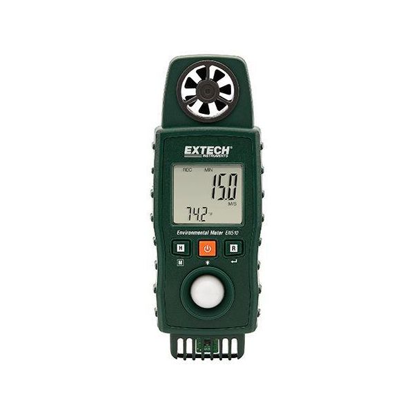 Extech EN510 er en 10-i-1 luftstrømsmåler, der måler lufthastighed, luftstrøm, lufttemperatur, type K-temperatur, varmeindeks, fugtighed, våd lufttemperatur, dugpunkt, kuldeindeks og lysniveau.