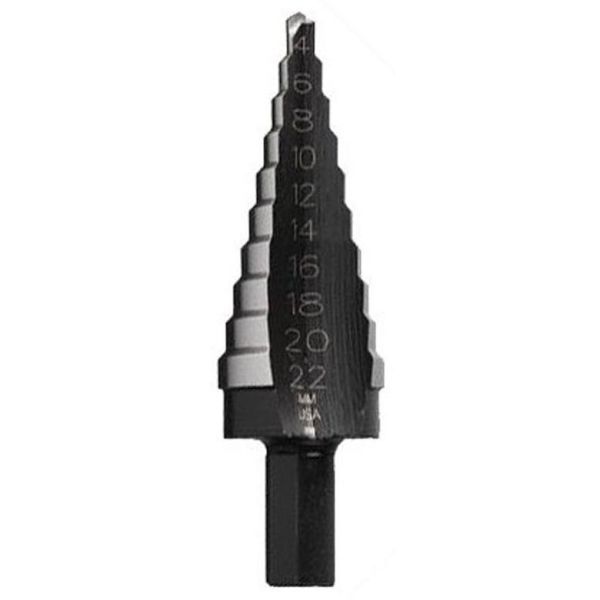 Trinbor fra Irwin med 10 trin i størrelserne 4-22 mm. Trinboret er ideelt til at holde boring i tynde materialer som blødt stål, kobber, messing, aluminium, plexiglas, plast, træ og laminat. Udstyret med selvcentrerende spids og en dobbeltskærpet kant med enkelt spiral til spånafgang og boring af helt runde huller med maksimal trinkontrol. Stigeboret har også flade overflader på skakten, hvilket forhindrer boret i at glide/dreje i borepatronen.