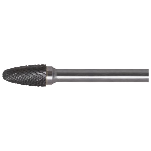 Roterende fil med spids form og afrundet top. Til afgratning og støbning. Medium tandet med spånafbryder og lavet af hårdmetal.
