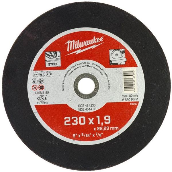 SCS 41 Contractor-serien skæreskive med en diameter på 230 mm, hulstørrelse på 22,2 mm og tykkelse på 1,9 mm. Til brug med iltbestandigt stål, hærdet støbejern, klingestål og værktøjsstål.