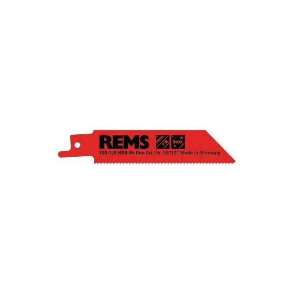 REMS bajonetsavklinge med en længde på 100 mm og en tændingssplit på 1,8 mm. Til metal, også rustfrit stål, ≥ 2 mm. Cant serration for roligt snit i tilfælde af lille tanddeling.
