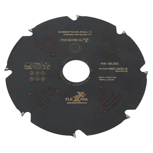 Diamantskive PCD Board X2, 160x1,9x30 (tilpasses til 20 mm). Skæring af cementbaserede skive-/pladematerialer såsom Cembrit/Minerit, Eternit (tag hensyn til asbestindhold), Aquapanel samt øvrige fiberforstærkede skive-/pladematerialer (vådrum, brandsikring, glasfiber, plast, grafit/karbonfibre osv.).