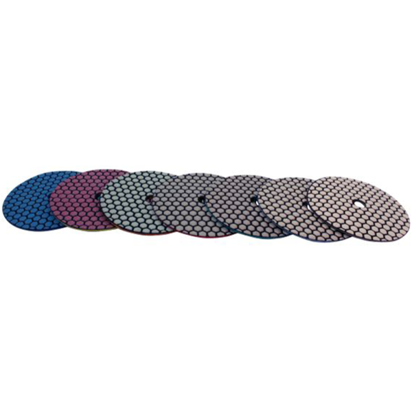 Sæt med 7 stk diamantslibeskiver, korn K50 - K3000. Højtydende diamantpoleringssystem til tørslibning af beton, bygningselementer, natursten. Den specielle segmentspecifikation giver en meget effektiv slibning/polering med et meget højt glanstal ved fuld poleringscyklus (K50 - K3000).