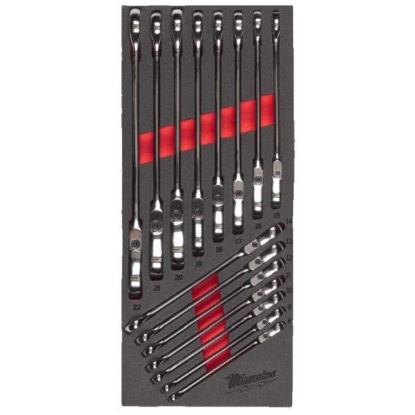 Skraldenøglesæt indeholdende 15 skraldenøgler i størrelserne 8-22 mm. Skraldenøglerne har et 180° drejeligt hoved for bedre adgang på steder med begrænset plads. MAX BITE åbent greb reducerer afrunding og stripping. 144 skraldetænder giver 2,5° buespænding for bedre adgang på trange steder. Holdbart materiale for længere levetid. Afrundede I-profilhåndtag for et behageligt greb.