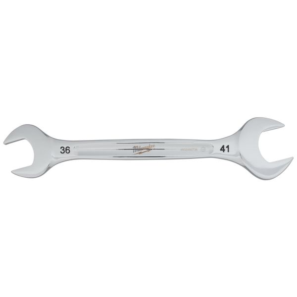 Milwaukee dobbelt ringnøgle med rundt L-profilhåndtag og smalt hoved for bedre adgang. Blækstemplede størrelser og kromfinish til rustbeskyttelse.